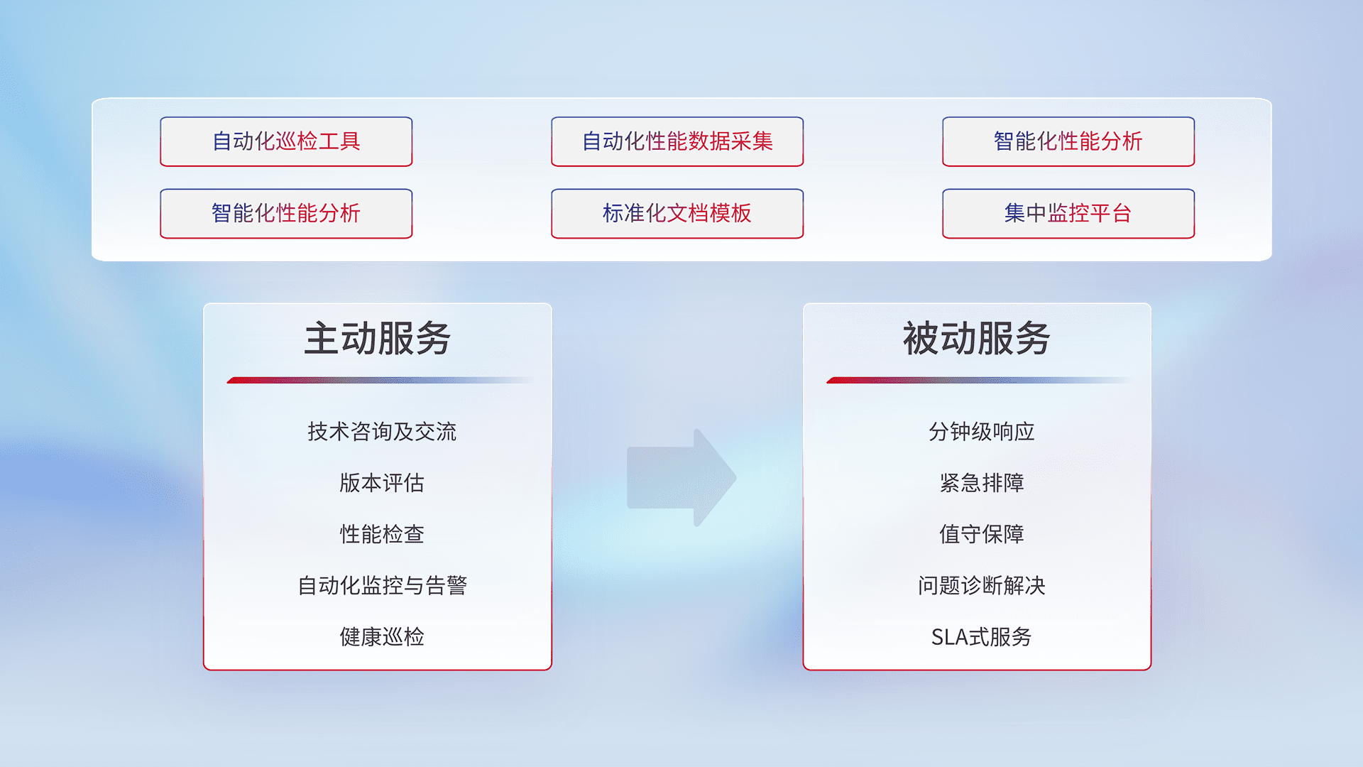 智能化工具和标准化文档,,,保障服务质量,,提供主动服务(包含技术咨询、、、版本评估、、、性能检查、、、、自动化监控与告警、、、健康巡检)和被动服务包含(分钟级响应、、紧急排障、、值守保障、、、问题诊断解决、、、、SLA服务)。。。